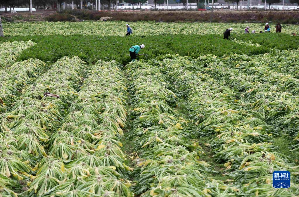 2月19日,村民在貴州省黔東南苗族侗族自治州榕江縣古州鎮(zhèn)車江大壩采收雪里蕻。