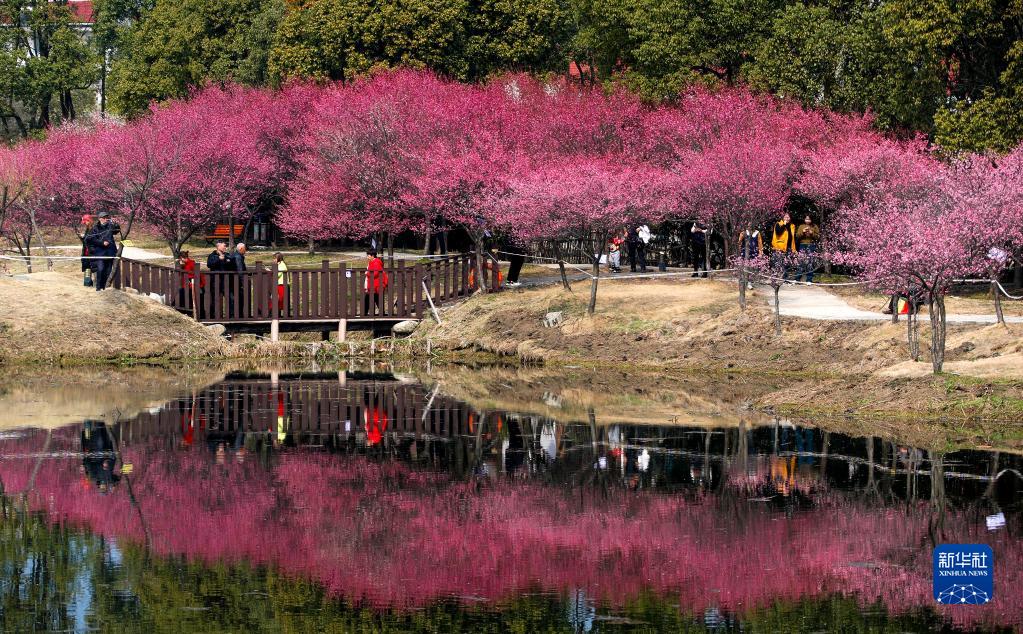 2月20日,游客在安徽黃山市歙縣練江牧場賞梅。