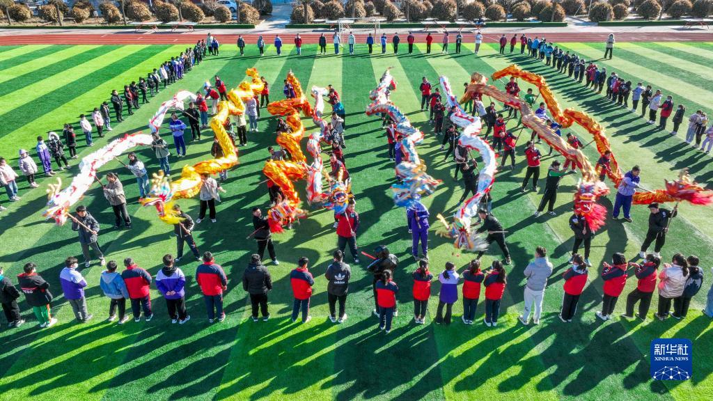 2月20日,河北省遵化市東舊寨鎮(zhèn)梁屯中心小學(xué)的學(xué)生表演舞龍(無人機照片)。