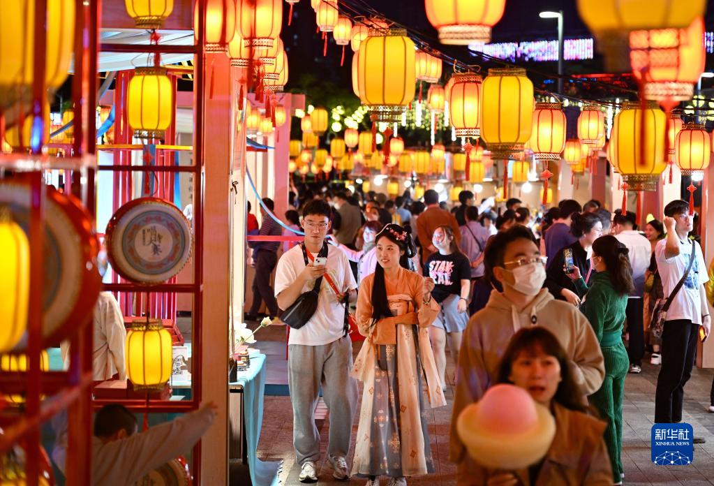 游客在海口日月廣場逛古風市集(2月19日攝)。