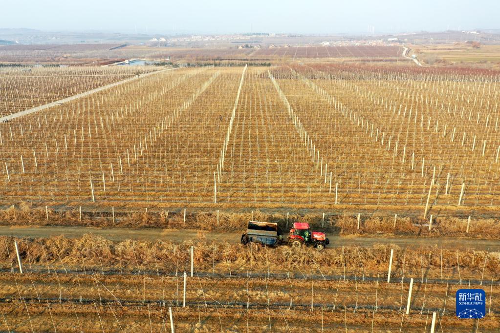 2月19日,在夏莊鎮甲夼區域鄉村振興共富黨建聯盟一處現代化蘋果產業基地內,村民在進行果樹修枝、施肥作業(無人機照片)。