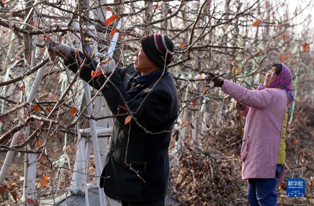 2月19日,在夏莊鎮甲夼區域鄉村振興共富黨建聯盟一處現代化蘋果產業基地內,村民在進行果樹修枝作業。