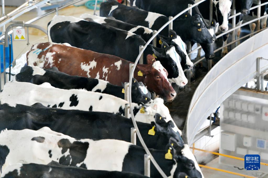 這是2月18日在武威市涼州區一家企業牧場拍攝的轉盤式擠奶機上的奶牛。