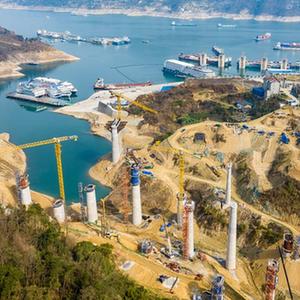 2月20日,工人在三峽庫區湖北省宜昌市秭歸縣三峽樞紐茅坪港疏港鐵路建設工地施工(無人機照片)。