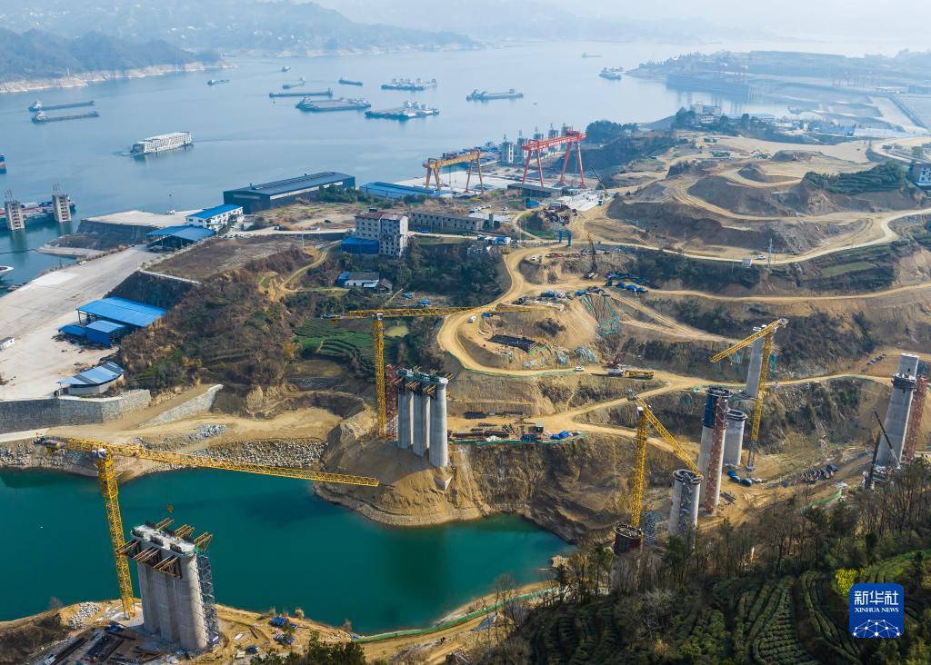 2月20日,工人在三峽庫區湖北省宜昌市秭歸縣三峽樞紐茅坪港疏港鐵路建設工地施工(無人機照片)。