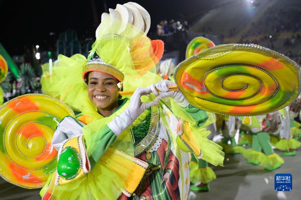 2月19日晚,在巴西里約熱內盧的桑巴大道,桑巴舞校演員參加狂歡節游行。