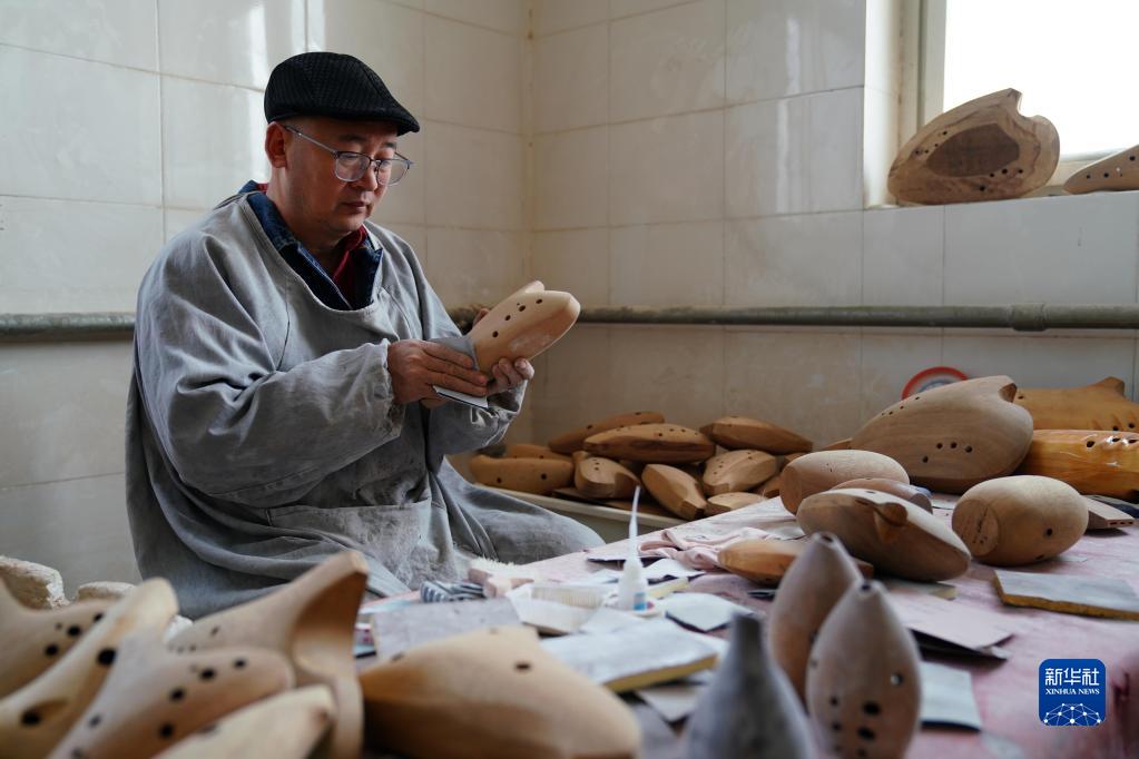 2月20日,陶笛藝人侯義敏打磨木質(zhì)陶笛半成品。