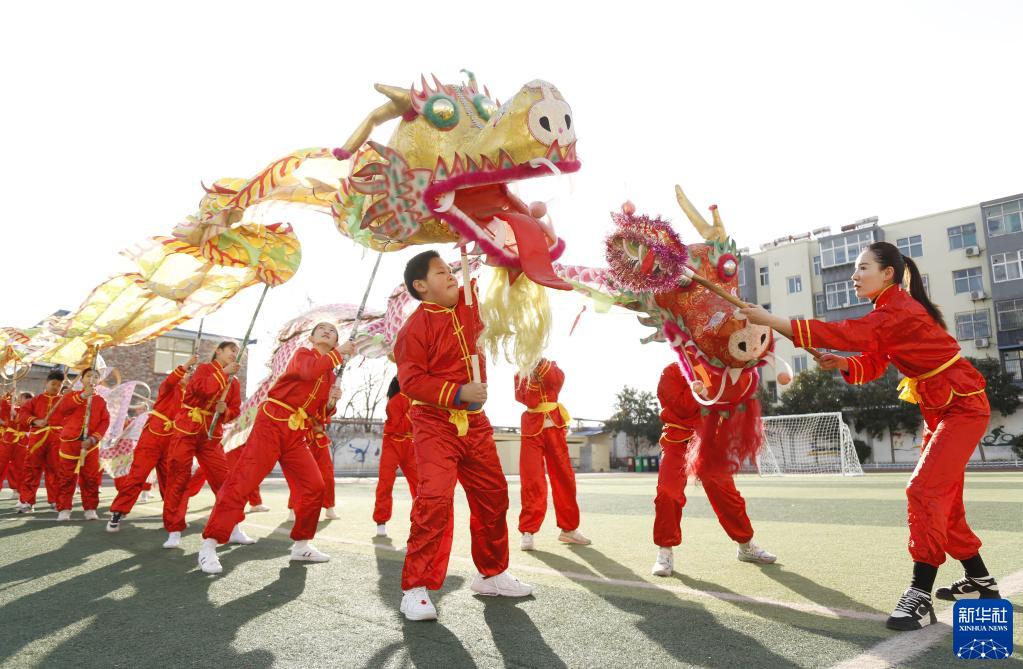 2月21日,河北省邢臺市東牛角小學學生在表演舞龍。