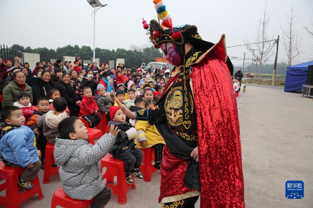 2月21日,四川眉山市東坡區心連心藝術團演員在崇禮鎮復盛社區表演川劇絕活“變臉”,并與現場觀眾互動。