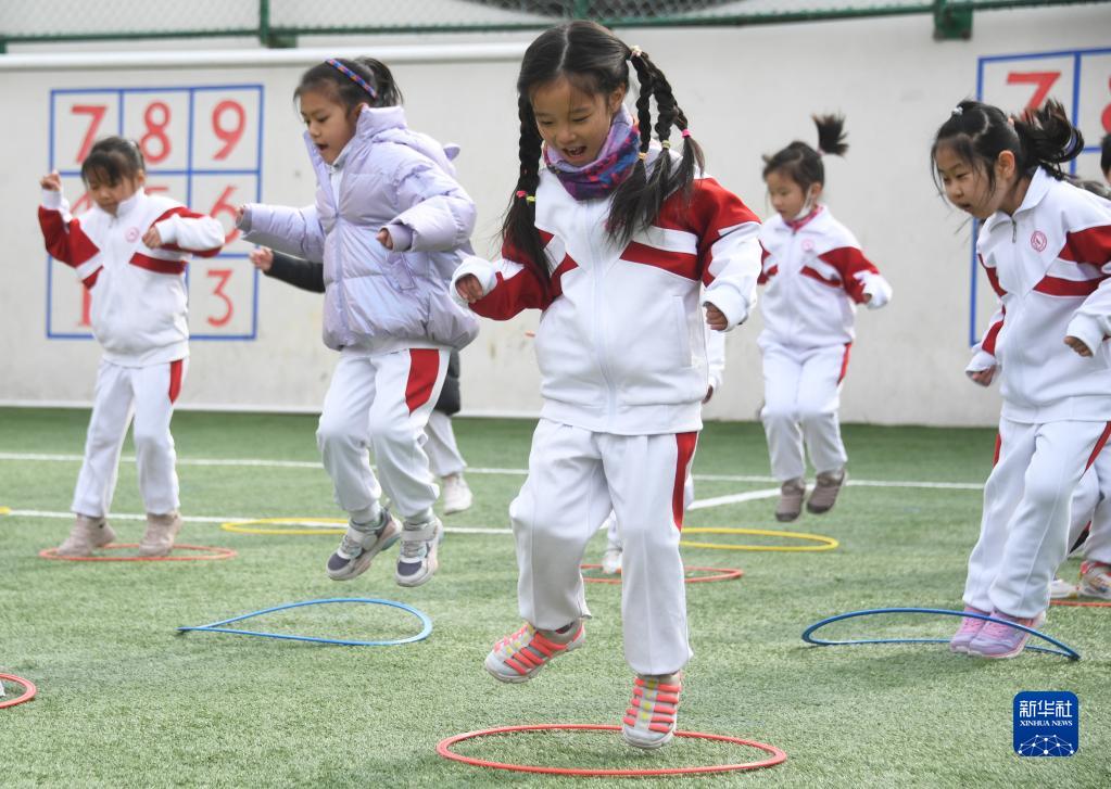 2月21日,在人大附中實驗小學,學生在體育課中做跳圈游戲。