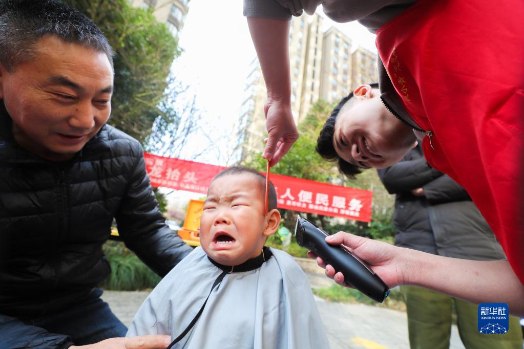 2月21日,理發(fā)師在浙江省湖州市德清縣武康街道英溪社區(qū)為小朋友免費(fèi)理發(fā)。