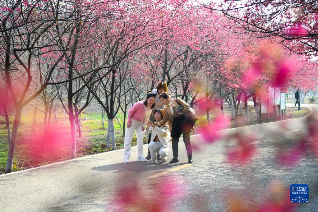 2月21日,游客在常寧市羅橋鎮廟山村櫻花園賞櫻游玩。