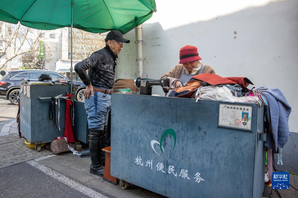 2月21日,在杭州市西湖區北山街道便民服務攤位,裁縫師陸衛芝(右)為社區居民修補衣物。北山街道幫助轄區內6處便民服務攤位統一辦理了杭州市便民服務證,方便他們為老城區內的居民提供便民服務。