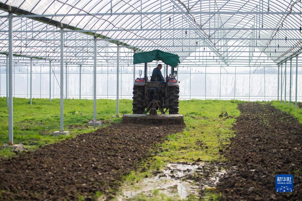 2月21日,在醴陵市沈潭鎮龐龍村,村民駕駛農機在新修建的育秧大棚內翻土備耕。