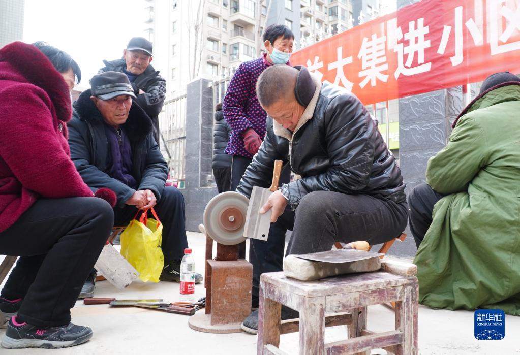 2月21日,在山東省成武縣文亭街道萬福城小區(qū),磨刀師傅劉長軍為小區(qū)居民打磨菜刀。