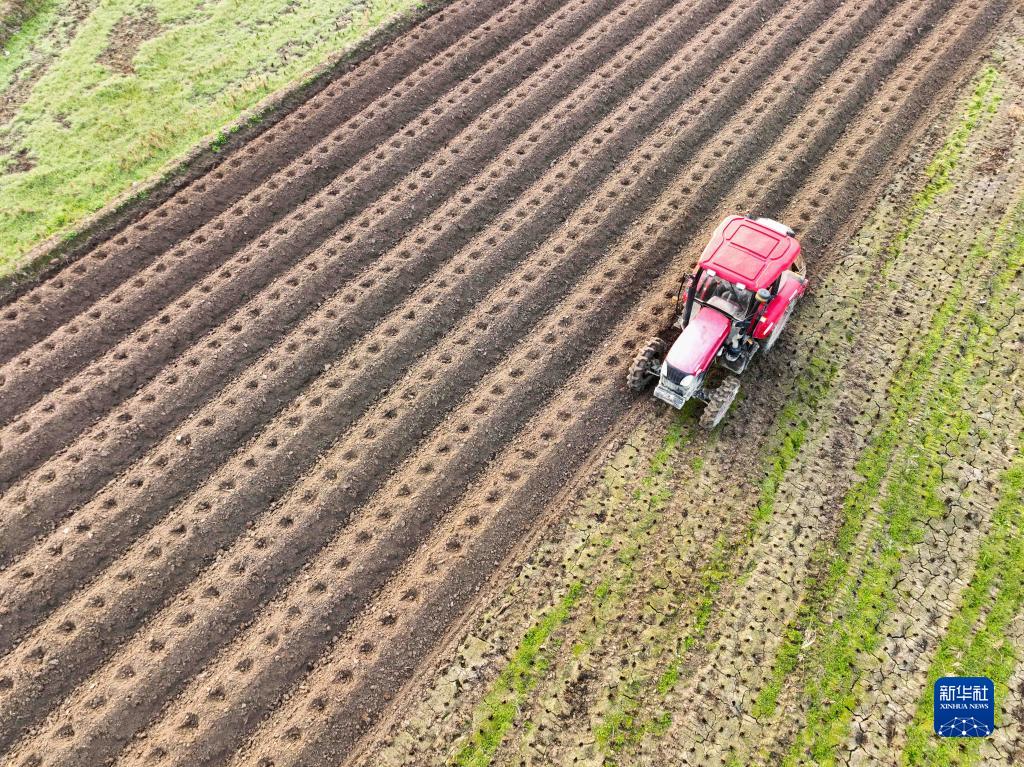 2月21日,在湖南省永州市道縣梅花鎮(zhèn)斯屋村,農(nóng)民駕駛農(nóng)機(jī)翻耕農(nóng)田(無(wú)人機(jī)照片)。