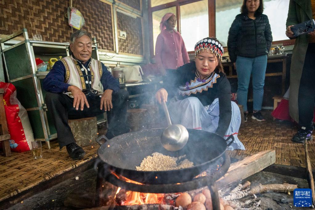 2月22日,云南省福貢縣施底村秘境灣景點的村民向游客展示傈僳族傳統方式制作爆米花。