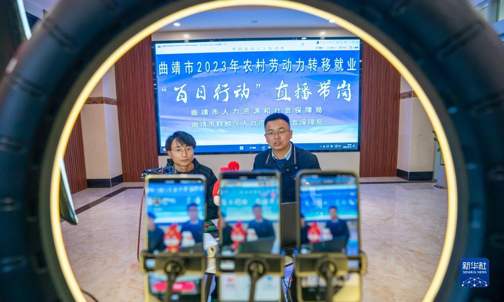 在云南省曲靖市麒麟?yún)^(qū)人力資源服務產(chǎn)業(yè)園,袁海波(右)通過網(wǎng)絡直播介紹就業(yè)崗位并宣傳就業(yè)服務政策(2月11日攝)。