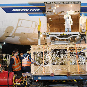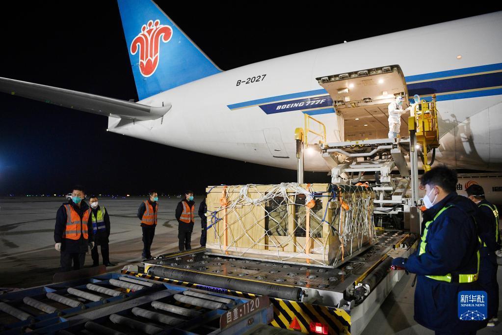 銀川河東國際機場工作人員對種羊進行轉運(2月22日攝)。