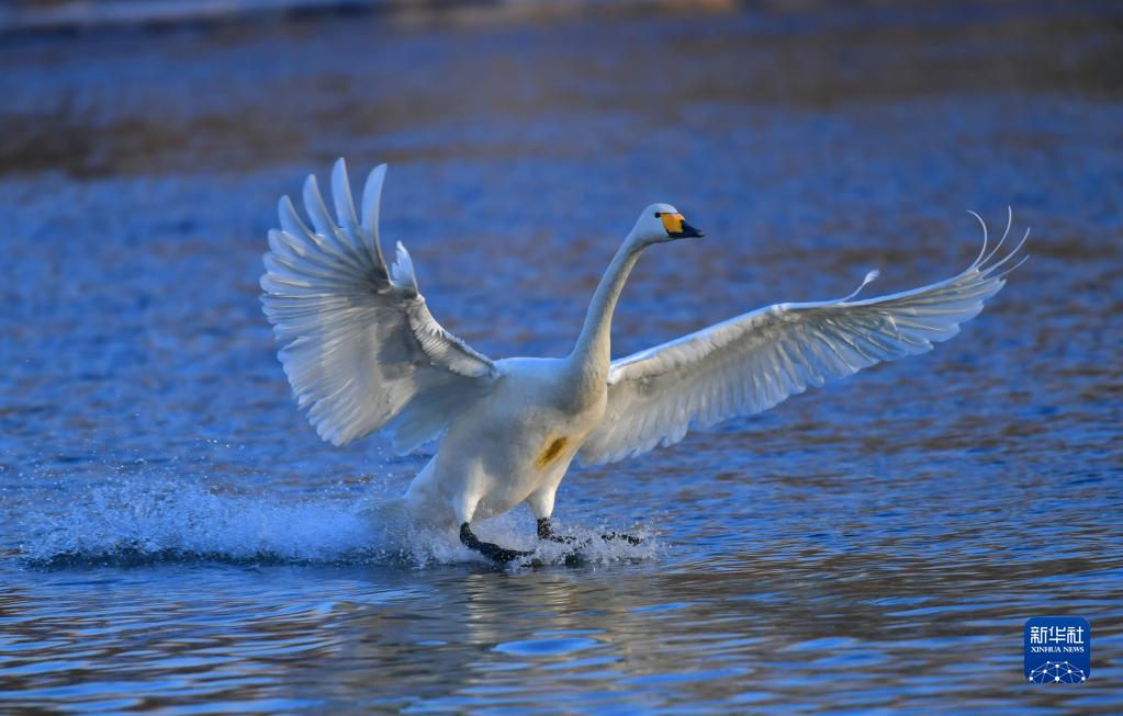 2月21日,在北票市八家子鄉(xiāng)紅村大凌河畔,天鵝在水面降落。