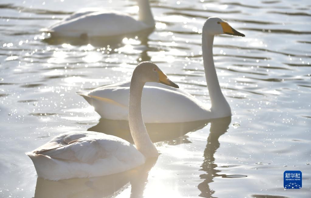 入冬以來,遼寧省北票市八家子鄉紅村大凌河畔的400多只白天鵝在河水淺灘處嬉戲覓食,吸引人們前來觀賞和拍照。