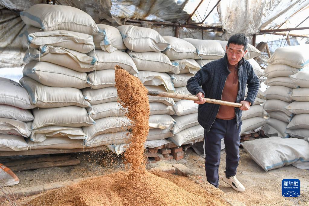 2月22日,農民曲艷偉在吉林市永吉縣北大湖鎮桄子溝村翻拌肉牛飼料。