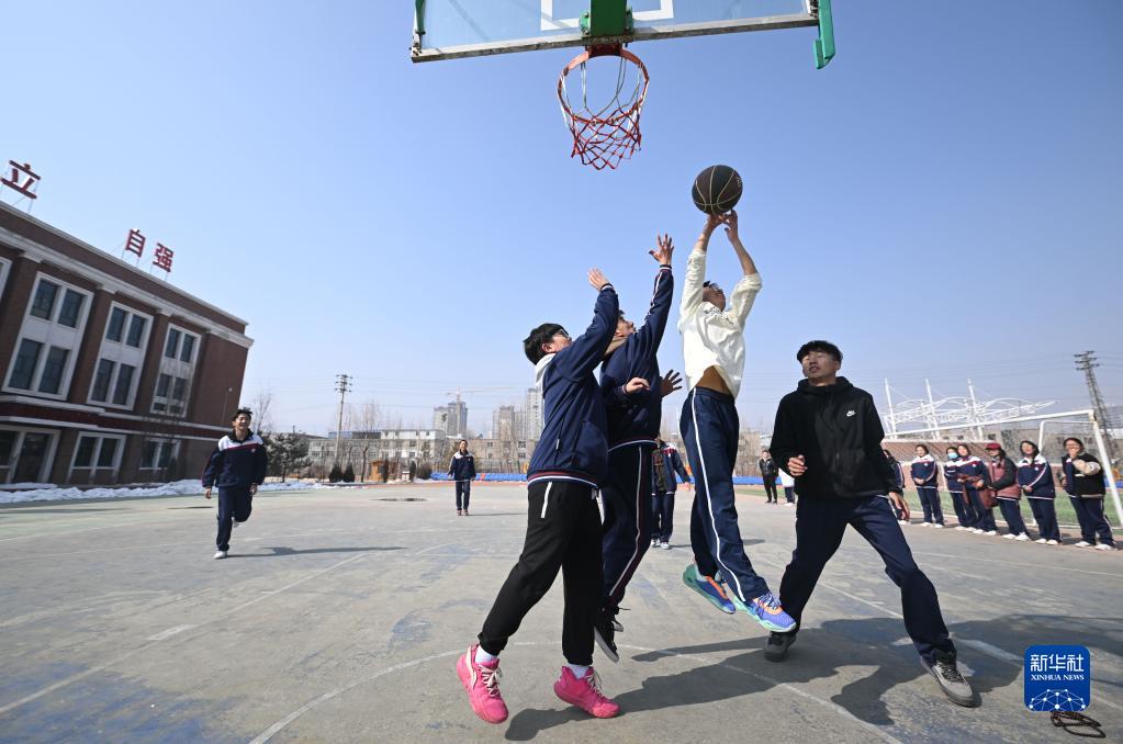 2月23日,西寧果洛中學學生在體育課上打籃球。
