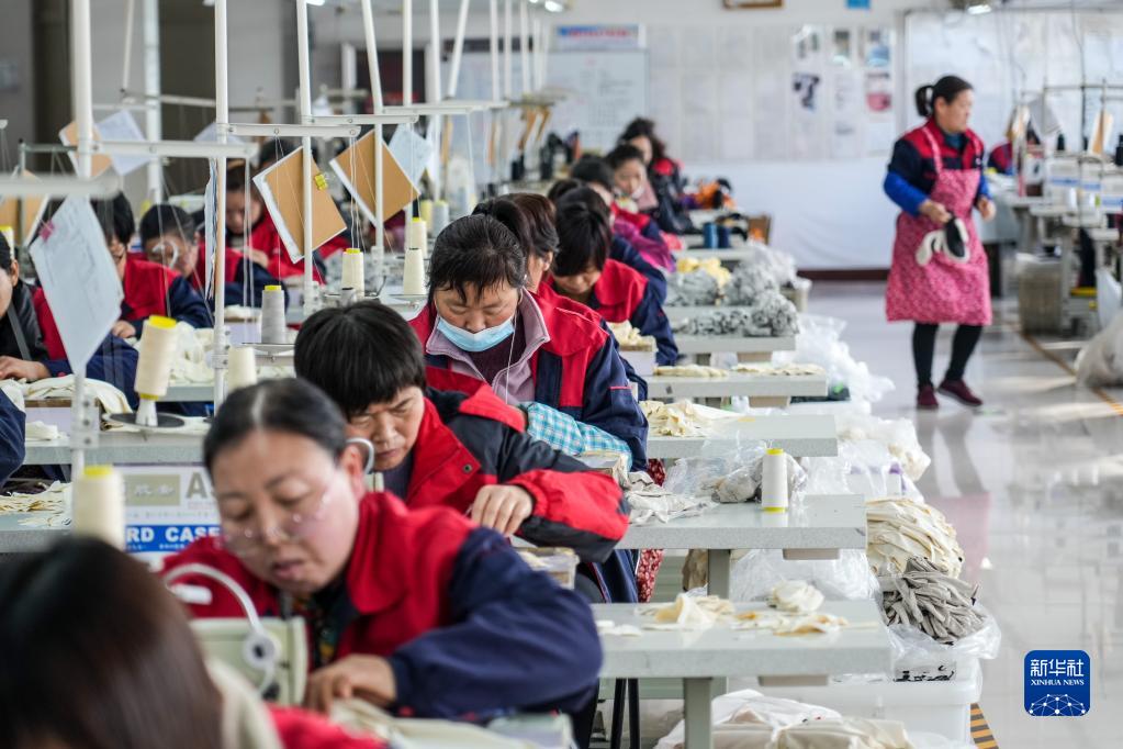 2月23日,在嘉祥縣的一家手套生產企業,員工在車間內加工生產手套。