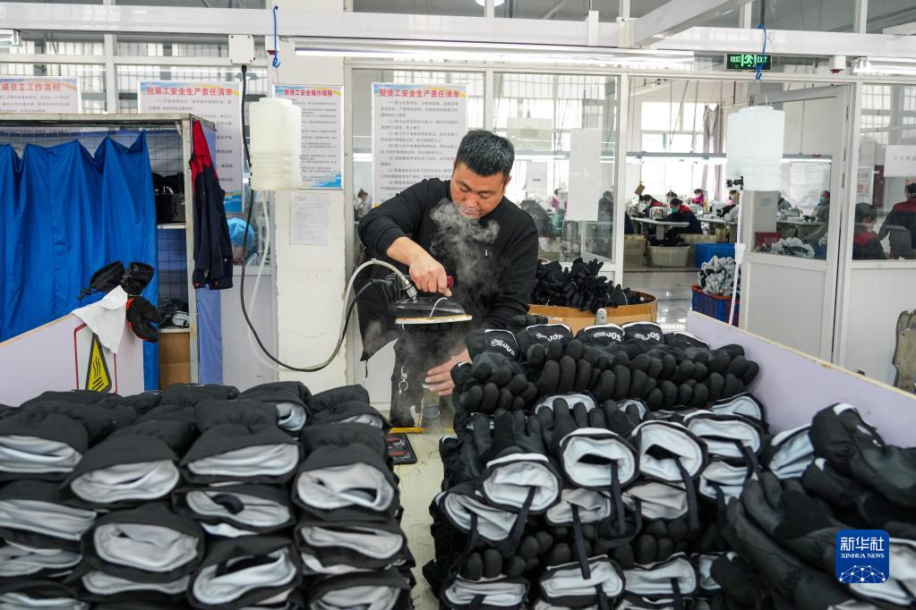 2月23日,在嘉祥縣的一家手套生產企業,員工在車間內加工生產手套。