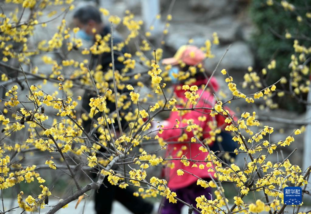 2月23日,市民在河北省石家莊市平安公園臘梅園散步。