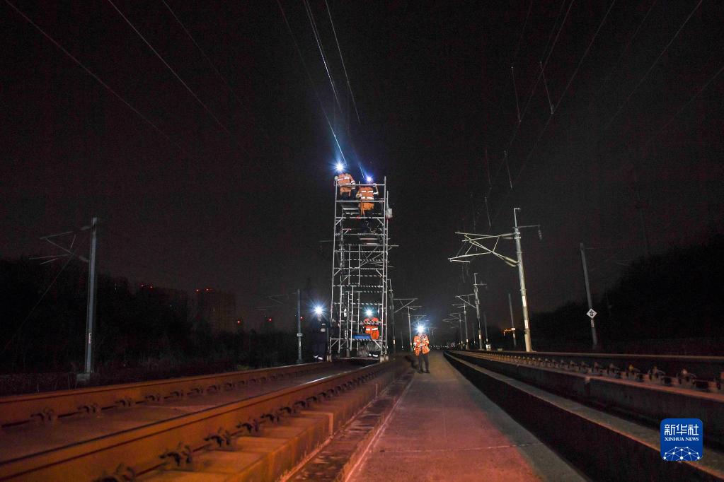 2月23日,綜合維修工在滬寧城際高鐵南京站至仙林站區(qū)間對(duì)接觸網(wǎng)進(jìn)行檢修維護(hù)。
