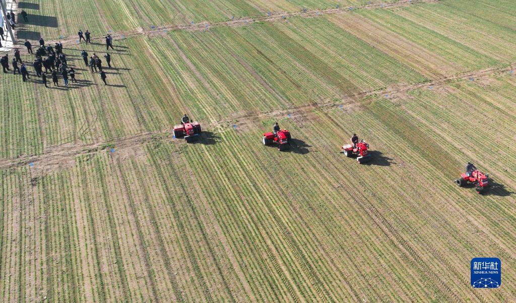 2月23日,在鄒平市長山鎮(zhèn)八方農(nóng)場活動現(xiàn)場,農(nóng)機手進行劃鋤式多功能麥苗鎮(zhèn)壓作業(yè)演示(無人機照片)。