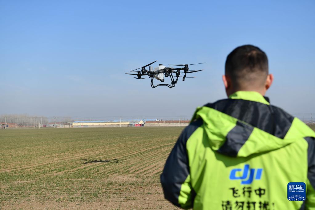 2月23日,在鄒平市長山鎮(zhèn)八方農場活動現場,農機手進行無人機智慧噴灑作業(yè)演示。