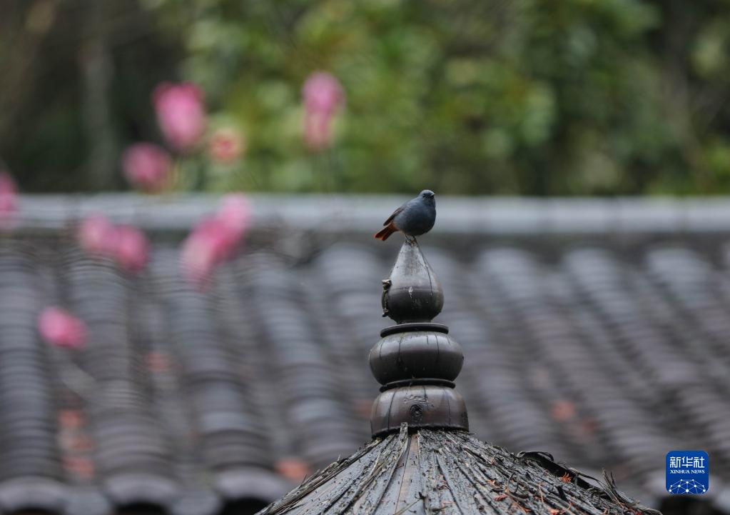2月23日,在張家界市武陵源區黃龍洞景區,一只小鳥在屋頂上停留。