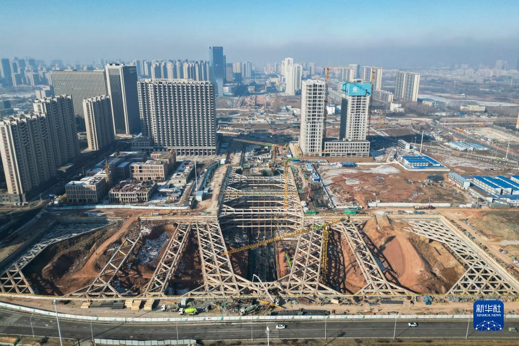 2月23日拍攝的長春市城市軌道交通6號線03標段三工區華慶路站施工現場(無人機照片)。