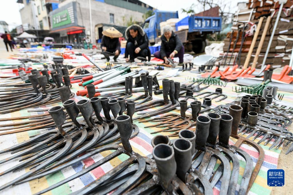 2月23日,湖南省常寧市勝橋鎮群眾在集市上選購農具。