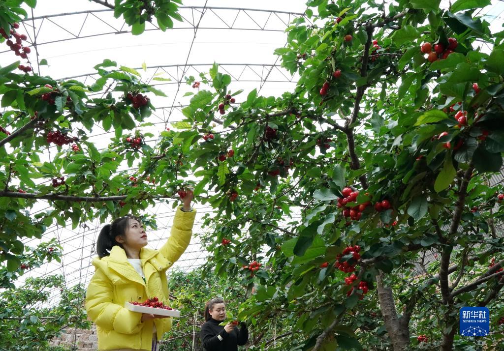 2月23日,游客在秦皇島市山海關區石河鎮一大棚內采摘櫻桃。