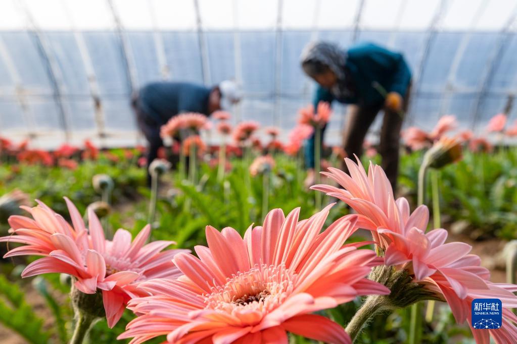 2月23日,農(nóng)民在河北省唐山市豐南區(qū)大新莊鎮(zhèn)柳林村花卉種植基地采收鮮花。