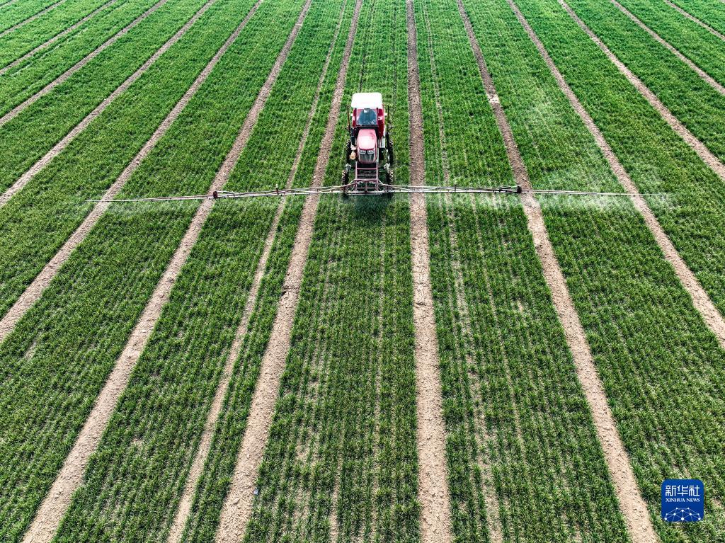 2月23日,河南省濟源市克井鎮酒務村農民駕駛農機在麥田噴灑農藥(無人機照片)。