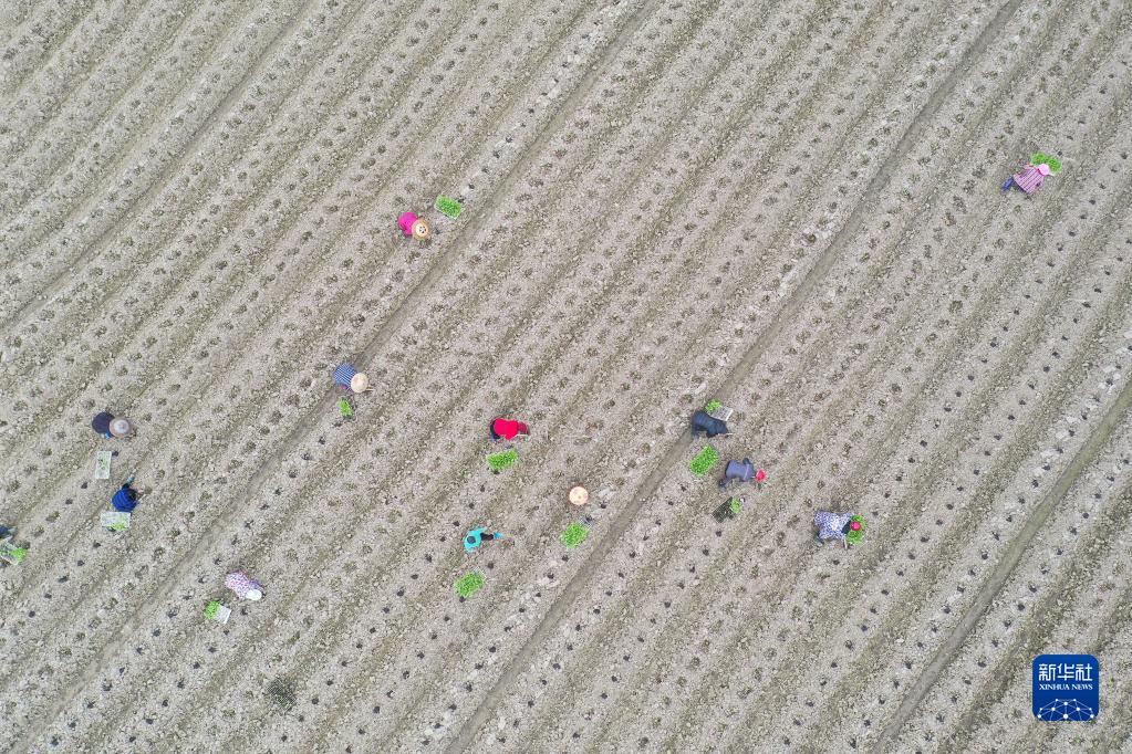2月24日,在湖南省永州市道縣梅花鎮宜陽村,村民在移栽幼苗(無人機照片)。