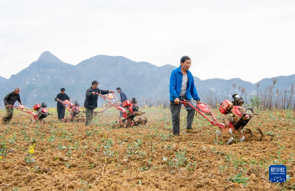2月24日,貴州省黔南布依族苗族自治州羅甸縣沫陽鎮紅星村村民駕駛小型農機在耕地。