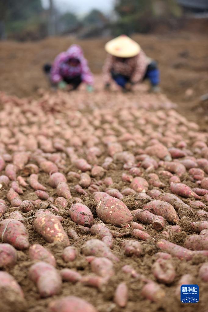 2月23日,貴州省黔東南苗族侗族自治州丹寨縣金泉街道老八寨村村民在育苗床擺放紅薯種。
