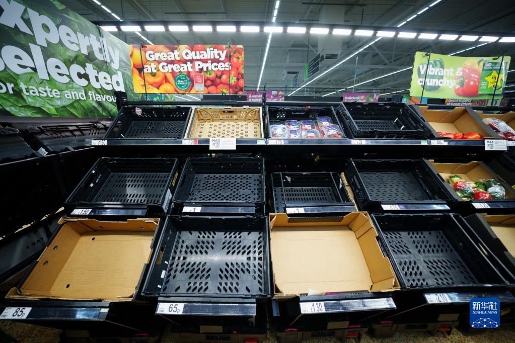 2月23日,在英國曼徹斯特,一家超市的水果和蔬菜貨架出現(xiàn)缺貨。