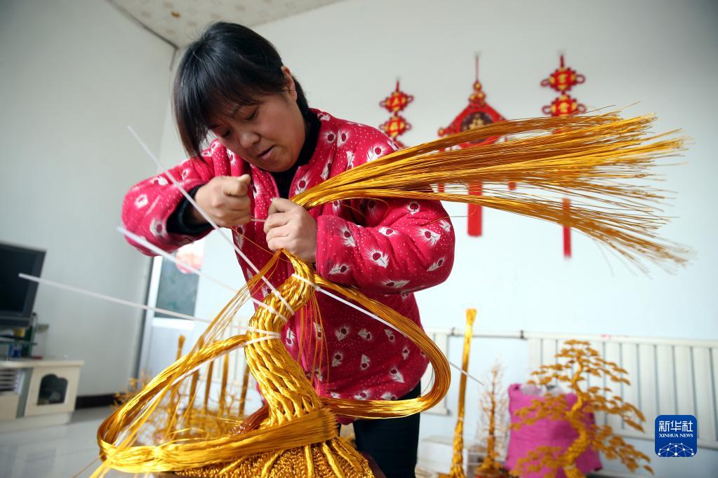 2月23日,濱州市沾化區(qū)下洼鎮(zhèn)村民王煥娥在家編織鋁絲工藝品。