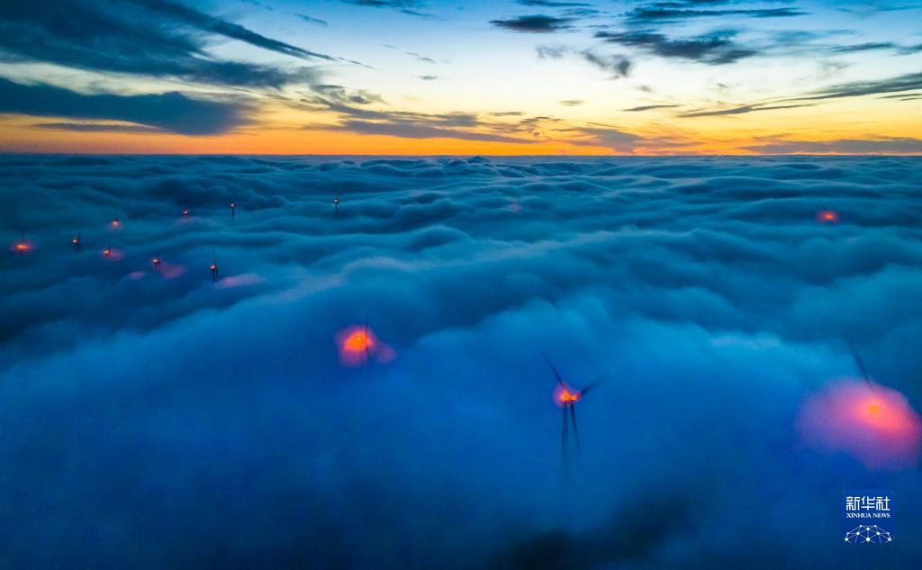 一場(chǎng)春雪過(guò)后,湖北省宜昌市秭歸縣云臺(tái)荒風(fēng)力發(fā)電場(chǎng)銀裝素裹,風(fēng)電機(jī)組在云海中旋轉(zhuǎn),美景如畫。