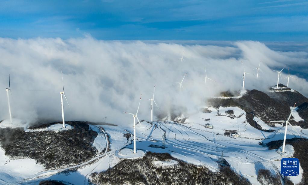 一場春雪過后,湖北省宜昌市秭歸縣云臺荒風(fēng)力發(fā)電場銀裝素裹,風(fēng)電機(jī)組在云海中旋轉(zhuǎn),美景如畫。