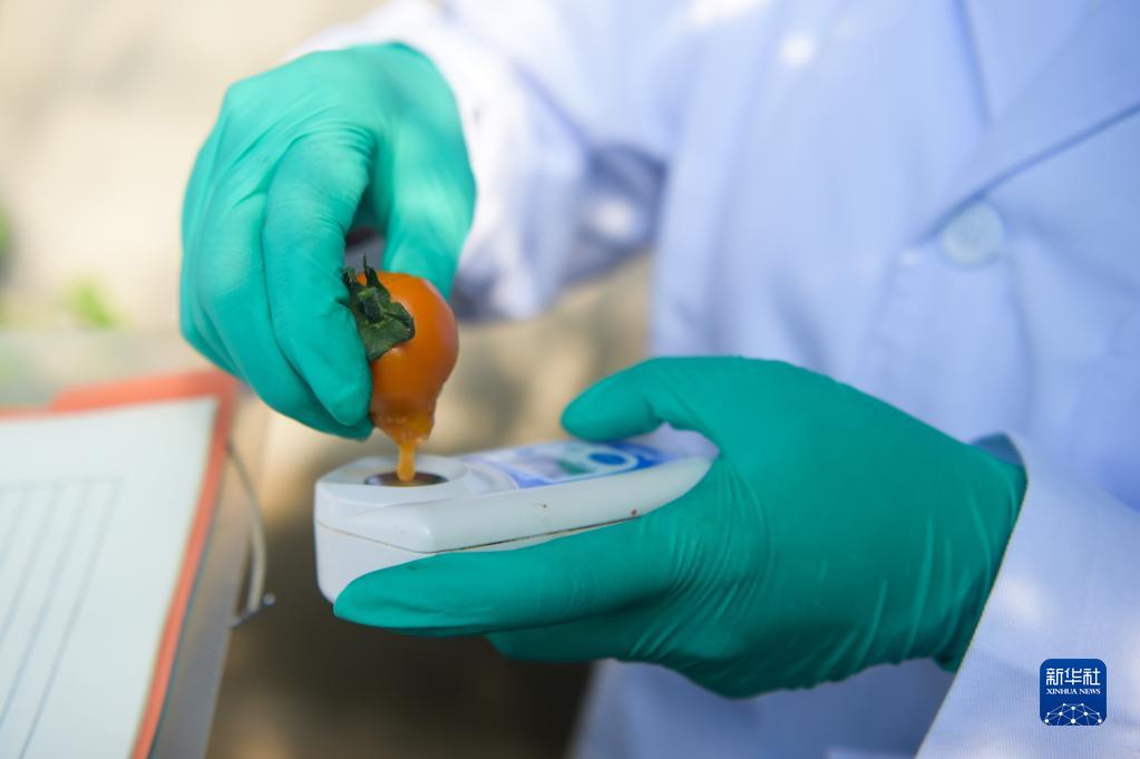 2月24日,在內蒙古自治區農牧業科學院蔬菜花卉研究所育種試驗基地,工作人員測定番茄糖度。