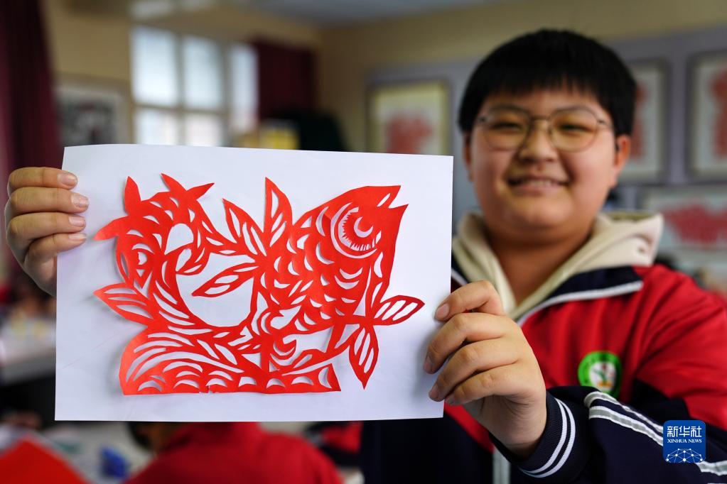 2月24日,河北邢臺經濟開發區景家屯小學學生展示自己的刻紙作品。