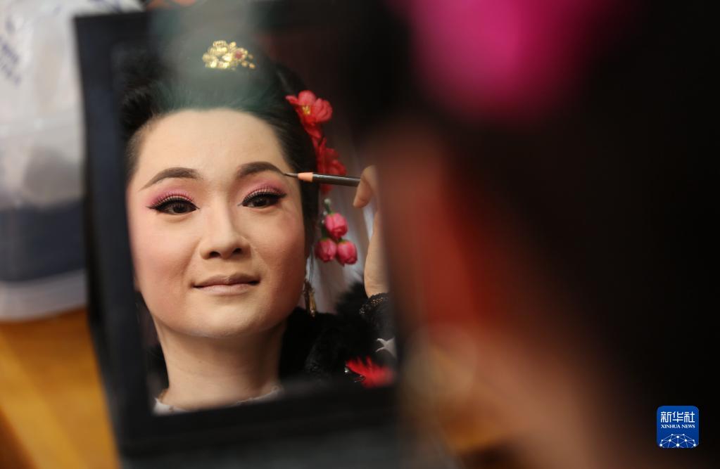2月24日,在臨沂市沂南縣依汶鎮東依汶村,演員在后臺進行演出前的準備。