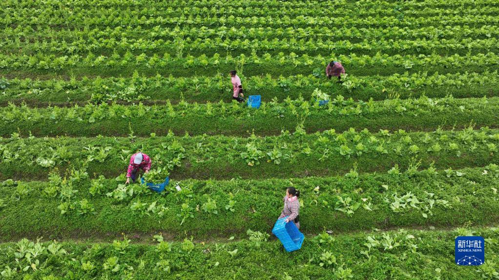 2月24日,貴州省錦屏縣銅鼓鎮(zhèn)花橋村村民在采摘芥菜(無人機(jī)照片)。